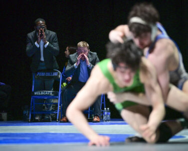 - RALPH WILSON/Sun-Gazette Correspondent Penn College coaches call from the sidelines while Gavin Gomes wrestles York’s Steven Enamorado-Ortiz at 174 during a college men’s wrestling dual meet at the Community Arts Center on Friday. York won 24-21.