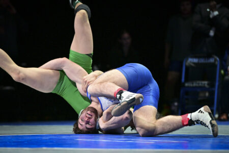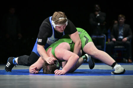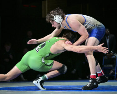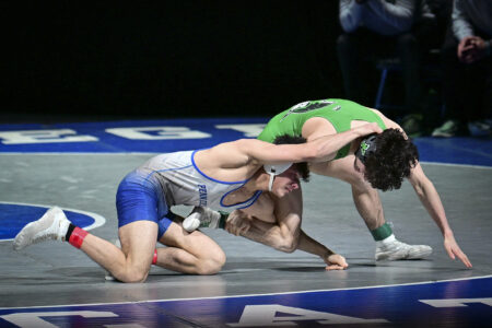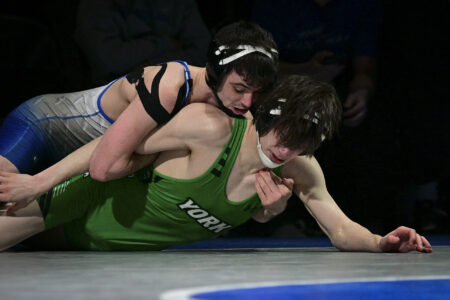 - RALPH WILSON/Sun-Gazette Correspondent Penn College’s Blake Dergham wrestles York’s Vincent Paolucci at 133 during a college men’s wrestling dual meet at the Community Arts Center on Friday. York won 24-21.