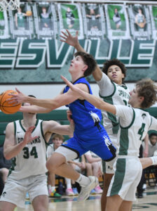 - MARK NANCE/Sun-Gazette Correspondent South Williamsport’s Andrew Walter (1) splits the Hughesville defense to shoot the lane in the second quarter.