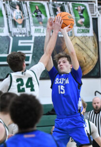 - MARK NANCE/Sun-Gazette Correspondent Hughesville’s Gavin Knarr (11) shoots over South Williamsport’s Levi Butler (15) in the first quarter.