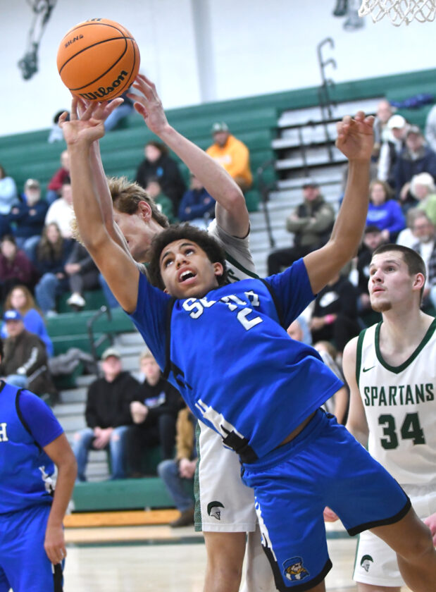 - MARK NANCE/Sun-Gazette Correspondent South Williamsport’s Samir Moy (2) tries the rebound the ball in the second quarter.
