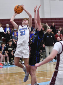 - MARK NANCE/Sun-Gazette Correspondent Loyalsock’s Brayden Cioffi (33) shoots around Warrior Run’s Ethan Balzer (34) in the second quarter.