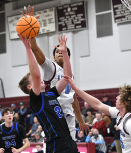 - MARK NANCE/Sun-Gazette Correspondent Loyalsock’s Saoj Jones (0) shoots between Warrior Run’s Ethan Balzer (34) and Max Burden (40) in the third quarter.