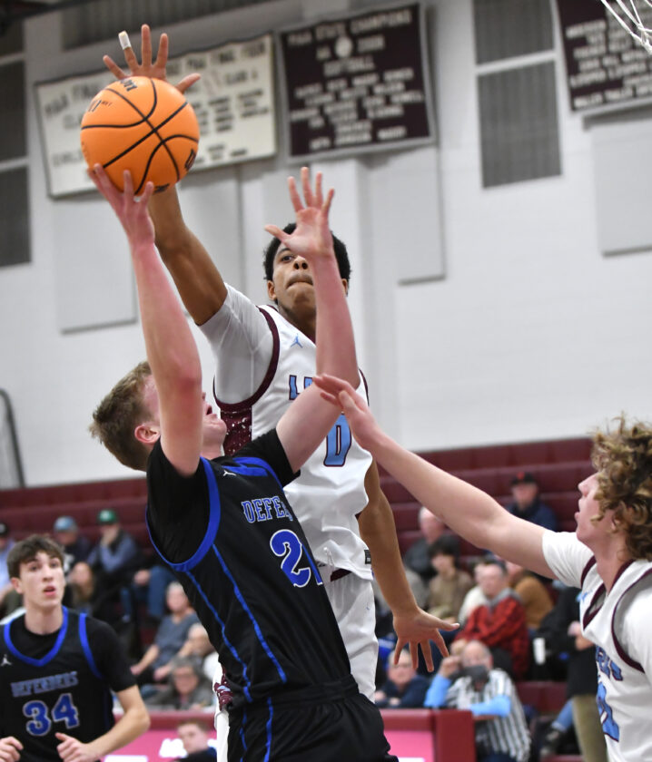 - MARK NANCE/Sun-Gazette Correspondent Loyalsock’s Saoj Jones (0) blocks an attempted shot by Warrior Run’s Cayden Robinson (55) in the fourth quarter.