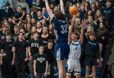 - Chance Quimby of South Williamsport can’t stop the shot by Gavin Burrows of Muncy at South Williamsport High School Friday night. South won the game 64-57. DAVE KENNEDY/Sun-Gazette