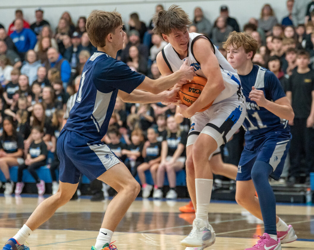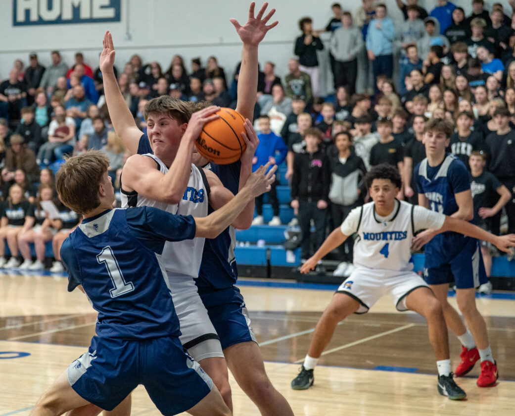 Andrew Walter of South Williamsport tries to put up a shot as he’s defended by Gavin Burrows and Nixon Lamper of Muncy at South Williamsport High School Friday night. South won the game 64-57. DAVE KENNEDY/Sun-Gazette