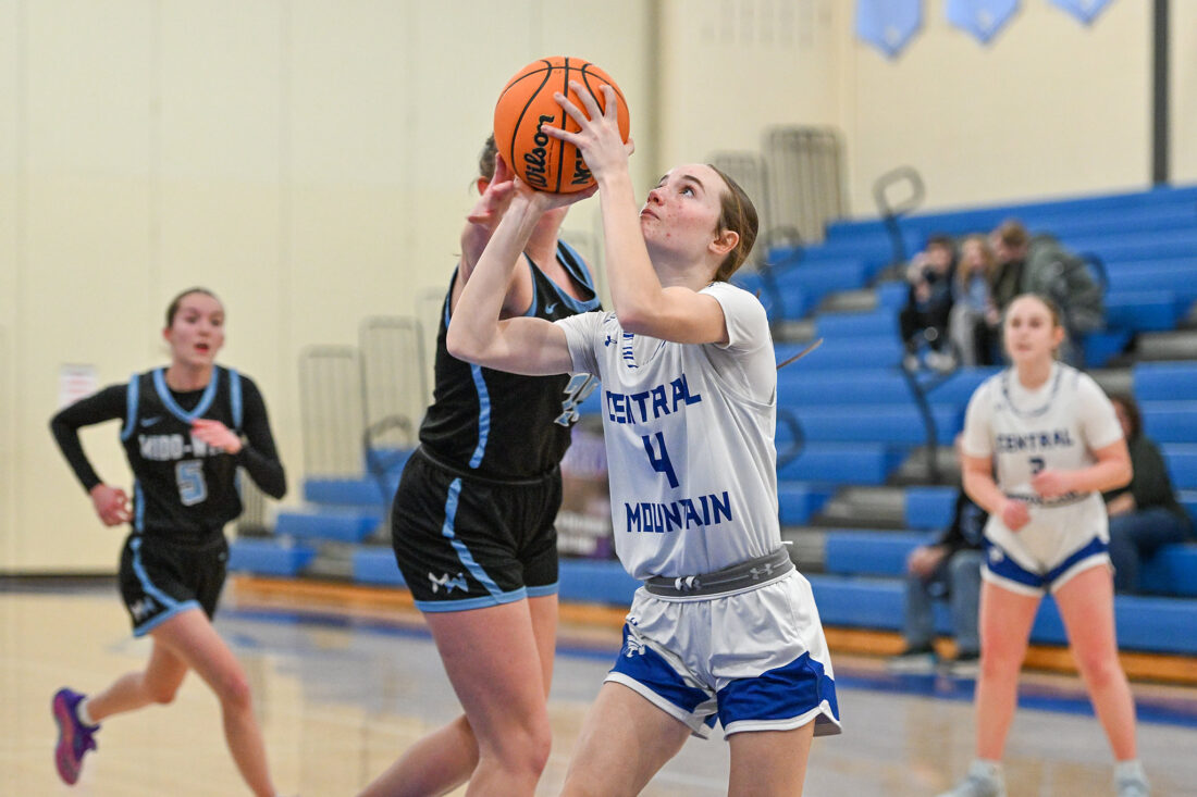 - TIM WEIGHT/Special to the Sun-Gazette Central Mountain’s Lane Walker (4) takes a contested shot during a girls basketball game against Midd-West on Wednesday, Jan. 28, 2026, at Central Mountain. The Wildcats won 52-32.