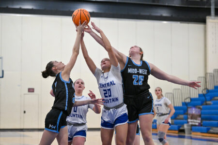 - TIM WEIGHT/Special to the Sun-Gazette Central Mountain’s Camdyn Weaver (20) battles multiple Midd-West defenders for a rebound during a girls basketball game on Wednesday, Jan. 28, 2026, at Central Mountain. The Wildcats won 52-32.