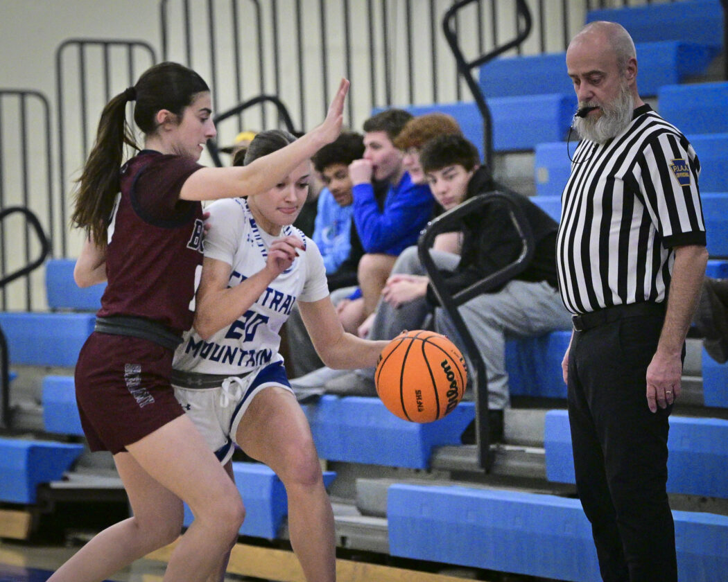 - RALPH WILSON/Sun-Gazette Correspondent Central Mountain’s Camdyn Weaver (20) tries to bring the ball past a Shikellamy defender during a high school girls basketball game at Central Mountain on Friday.