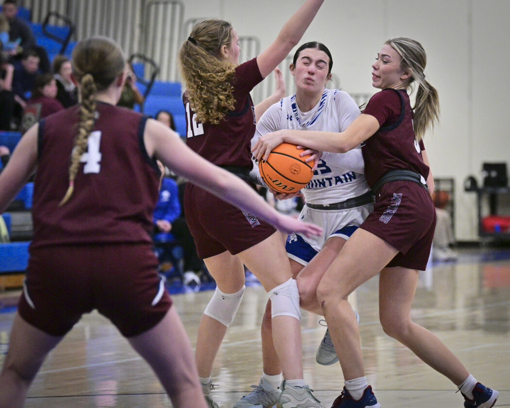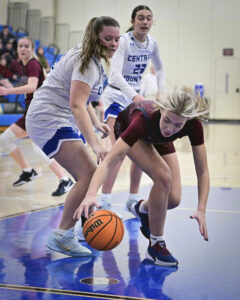 - RALPH WILSON/Sun-Gazette Correspondent Central Mountain’s Mya Krout (42) and Shikellamy’s Kelsey Deitrich (5) reach for a loose ball during a high school girls basketball game at Central Mountain on Friday.