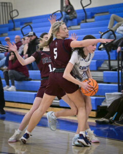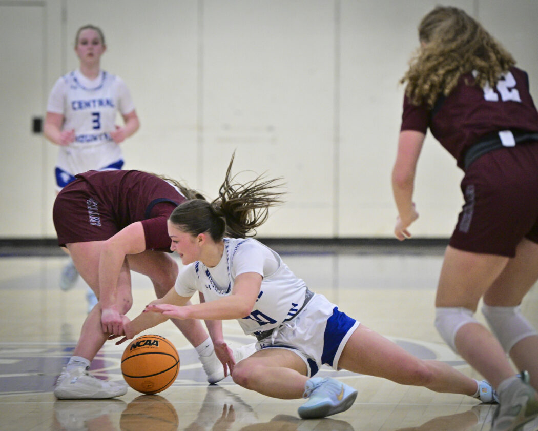 - RALPH WILSON/Sun-Gazette Correspondent Central Mountain’s Camdyn Weaver (20) reaches for a loose ball around a Shikellamy defender during a high school girls basketball game at Central Mountain on Friday.