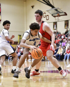 RALPH WILSON/Sun-Gazette Correspondent South Williamsport's Chance Quimby (11) moves the ball past Sullivan County's Colin King (12) during the boys Mid-Penn West championship game at St. John Neumann on Saturday. South won 57-50.
