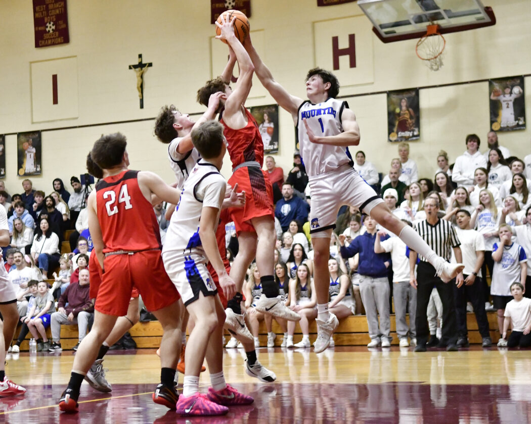 - RALPH WILSON/Sun-Gazette Correspondent South Williamsport’s Andrew Walter reaches for a rebound around Sullivan County’s Lucas King during the boys Mid-Penn West championship game at St. John Neumann on Saturday. South won 57-50.
