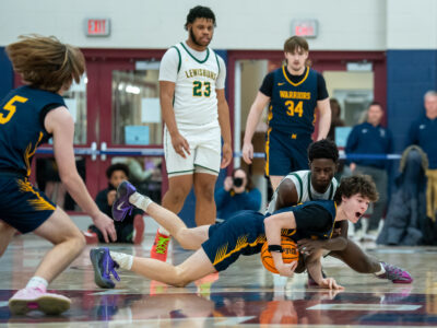 - Isaac Erlandson of Montoursville and Rebira Jemama of Lewisburg dive for a loose ball at Shikellamy High School. Lewisburg won 56-53 to win the District IV AAAA Champions. DAVE KENNEDY/Sun-Gazette