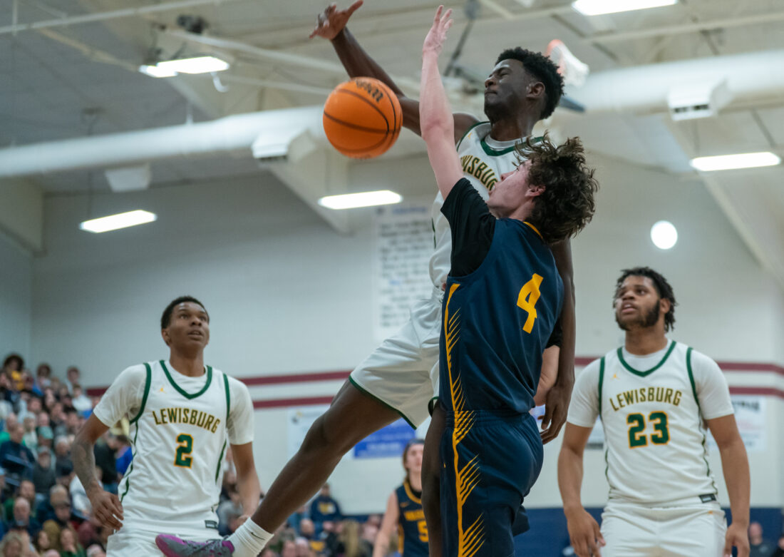 - Isaac Erlandson of Montoursville has his shot blocked by Rebira Jemana of Lewisburg at Shikellamy High School. Lewisburg won 56-53 to win the District IV AAAA Champions. DAVE KENNEDY/Sun-Gazette