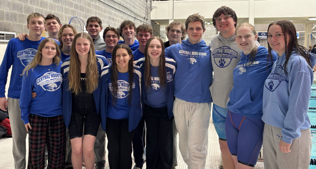 PHOTO PROVIDED Central Mountain’s boys and girls swimming teams pose together for a photograph at the District 6 Class AAA championships. Gabriella Hosley of Central Mountain won gold in the 100 fly and secured a spot at the state championship meet in Lewisburg in March.