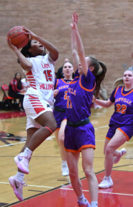 - MARK NANCE/Sun-Gazette Correspondent Williamsport’s Laylah Martin(15) drives the lane around Danville’s Olivia Poe (10) in the second quarter.