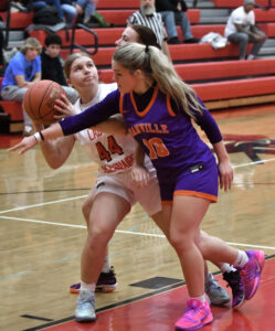 - MARK NANCE/Sun-Gazette Correspondent Williamsport’s Jaelynn Helmrich (44) looks for a shot around Danville’s Olivia Poe (10) in the third quarter.