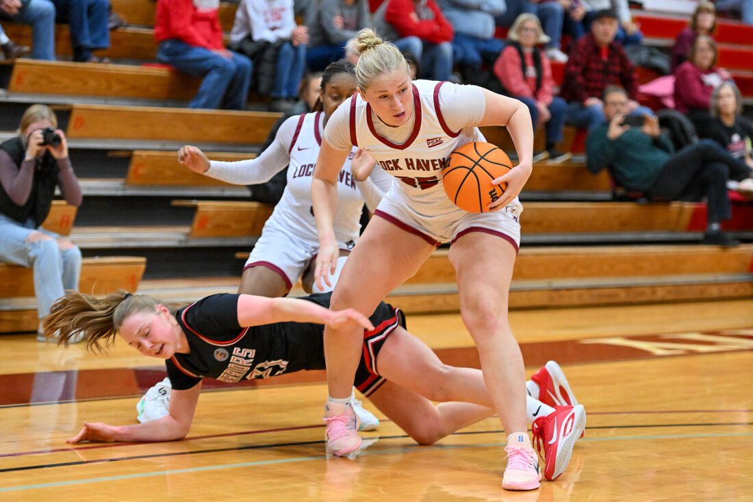 - TIM WEIGHT/Special to the Sun-Gazette Lock Haven’s Madeline Evans (25) obtains a loose ball during a women’s basketball game against East Stroudsburg on Wednesday, Feb. 18, 2026, at Thomas Fieldhouse. The Bald Eagles won 70-59.