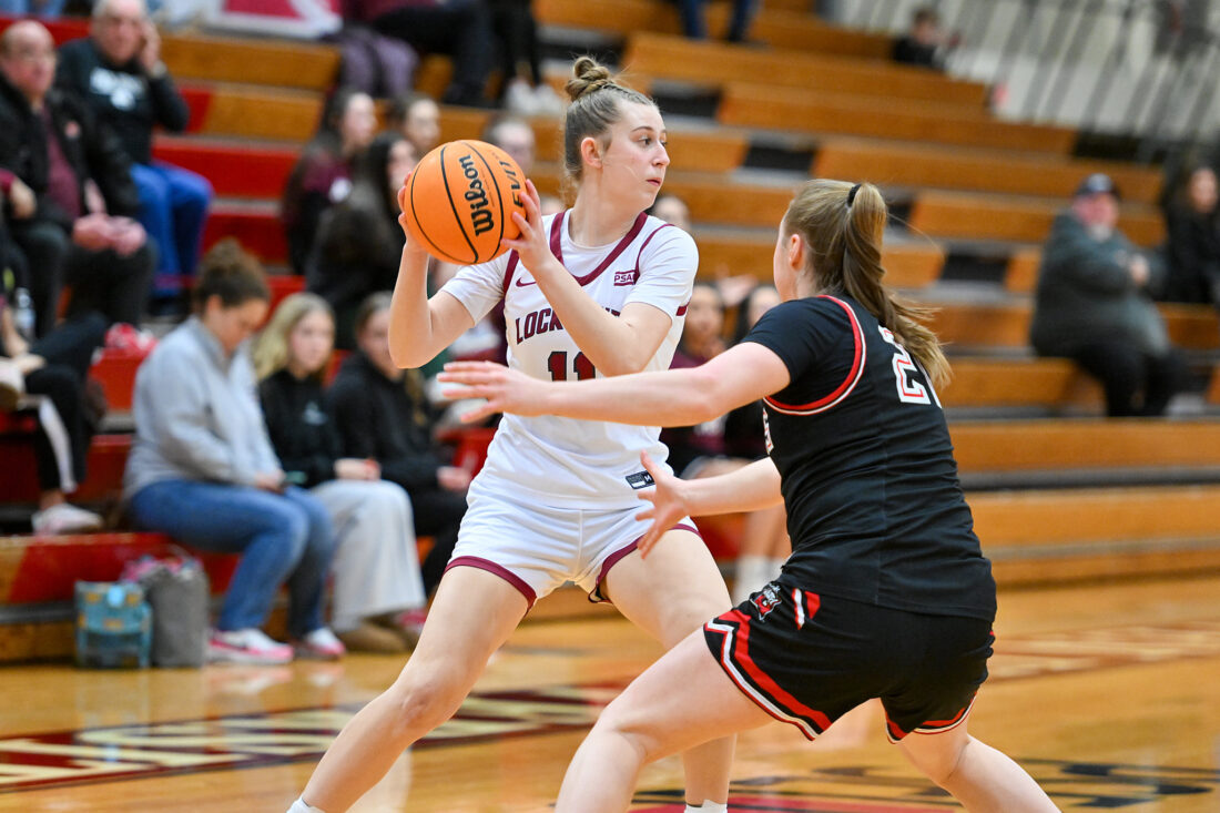 TIM WEIGHT/Special to the Sun-Gazette Lock Haven's Lacey Kriebel (11) looks to pass the ball during a women's basketball game against East Stroudsburg on Wednesday, Feb. 18, 2026, at Thomas Fieldhouse. The Bald Eagles won 70-59.