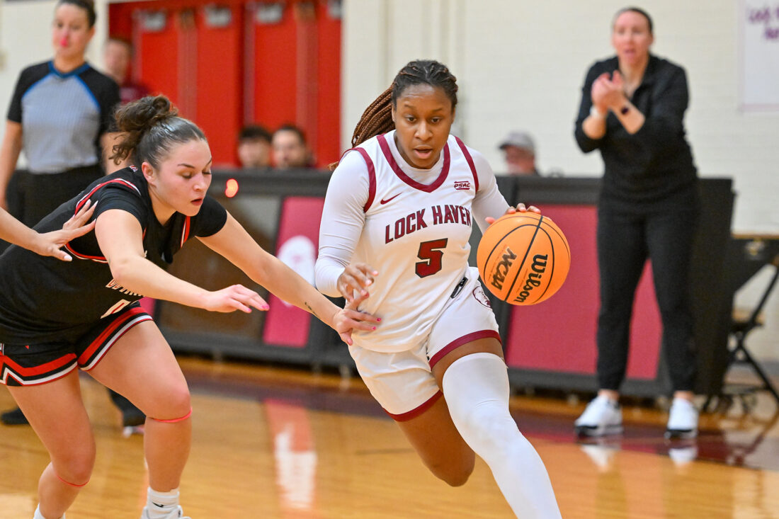 TIM WEIGHT/Special to the Sun-Gazette Lock Haven's Julia Whesper (1) dribbles the ball as the scans the court during a women's basketball game against East Stroudsburg on Wednesday, Feb. 18, 2026, at Thomas Fieldhouse. The Bald Eagles won 70-59.
