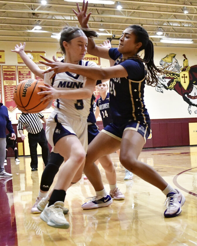 - RALPH WILSON/Sun-Gazette Correspondent Muncy’s Rosie Zalonis (3) looks to pass around Northwest’s Areya Williams (25) during the girls Mid-Penn West championship game at St. John Neumann on Saturday. Northwest won 42-41.