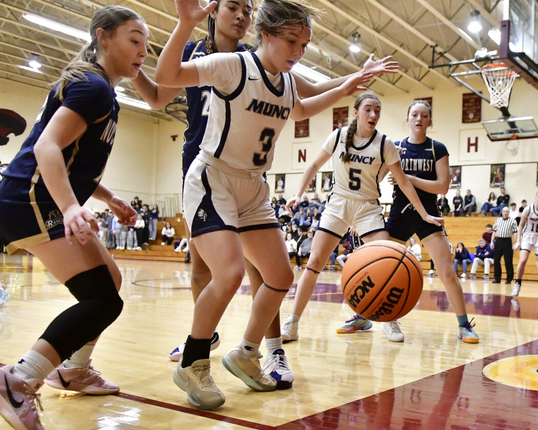 - RALPH WILSON/Sun-Gazette Correspondent Muncy’s Rosie Zalonis (3) brings the ball downcourt around Northwest’s defense during the girls Mid-Penn West championship game at St. John Neumann on Saturday. Northwest won 42-41.