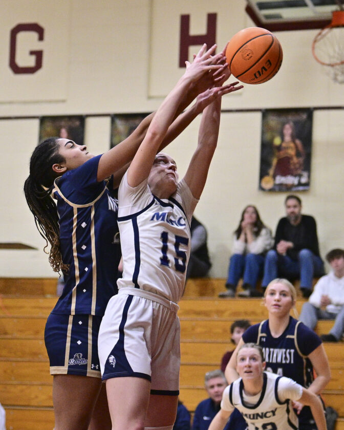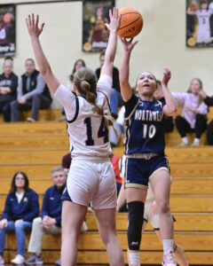 - RALPH WILSON/Sun-Gazette Correspondent Northwest’s Ashlyn Hermanofsk shoots over the head of Muncy’s Emma McCormick (14) during the girls Mid-Penn West championship game at St. John Neumann on Saturday. Northwest won 42-41.