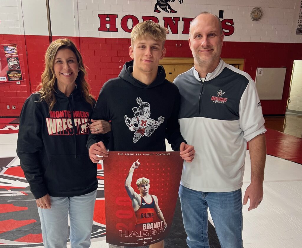 PHOTO PROVIDED Montgomery's Brandt Harer poses with a banner after he secured his 200th career victory alongside his parents, coach Denny Harer and Jen. Harer became the second wrestler in Pennsylvania history to reach 200 or more wins.