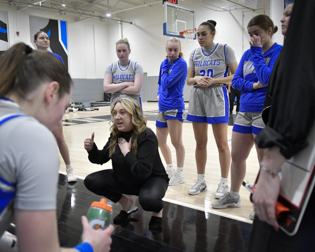 RALPH WILSON/Sun-Gazette Correspondent Penn College head coach Britni Mohney meets with her players during the United East semifinal game against PS Abington on Wednesday at Bardo Gym. PS Abington won 67-62.