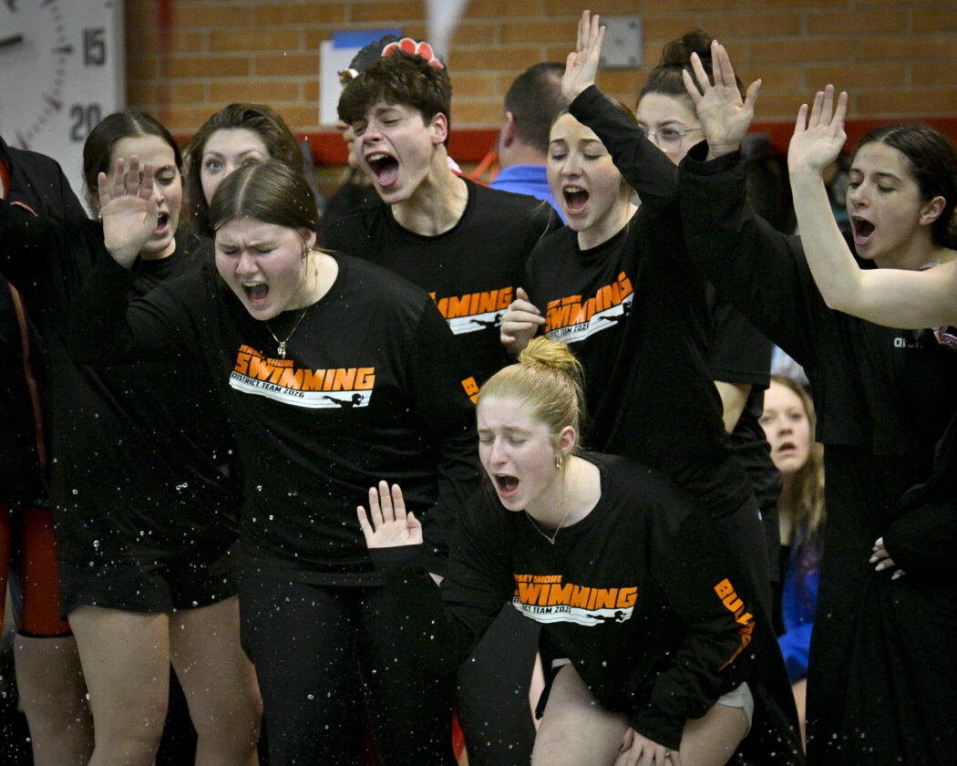 RALPH WILSON/Sun-Gazette Correspondent Jersey Shore swimmers cheer for Lila Nestlerode as she competes in the girls 200 Freestyle during the District 4 Championship meet at Williamsport on Wednesday.