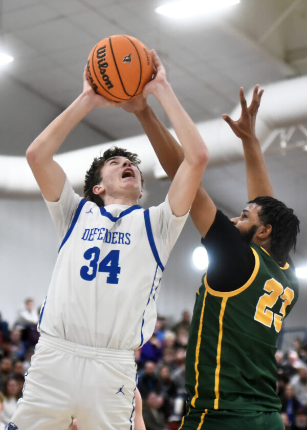 - LARRY DEKLINSI/Special to the Sun-Gazette Warrior Run’s Ethan Baker attempts a shot while defended by Lewisburg’s Nazir Meredith during the PHAC semifinals. The Defenders are the District 4 champions for the first time since 1988.