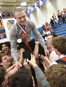 - MARK NANCE/Sun-Gazette Correspondent Sullivan County players celebrate with head coach Glenn Vaughan after the win over North Penn Liberty for the Class A District IV championship at Montoursville High School Thursday.