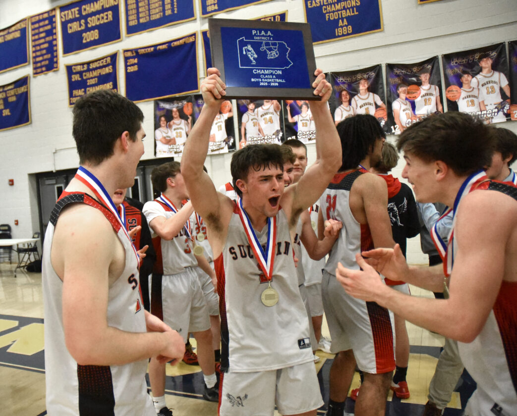Sullivan forced 10 fourth quarter turnovers and defense became offense as the Griffins rallied for a dramatic 58-54 win, becoming the program’s third district champion. Tucker Blasi’s steal and dish to Dom Marotti put Sullivan (22-4) ahead to stay with 47 seconds remaining and the Griffins earned a spot in Friday’s state tournament at Williamsport against Coventry Christian.