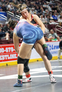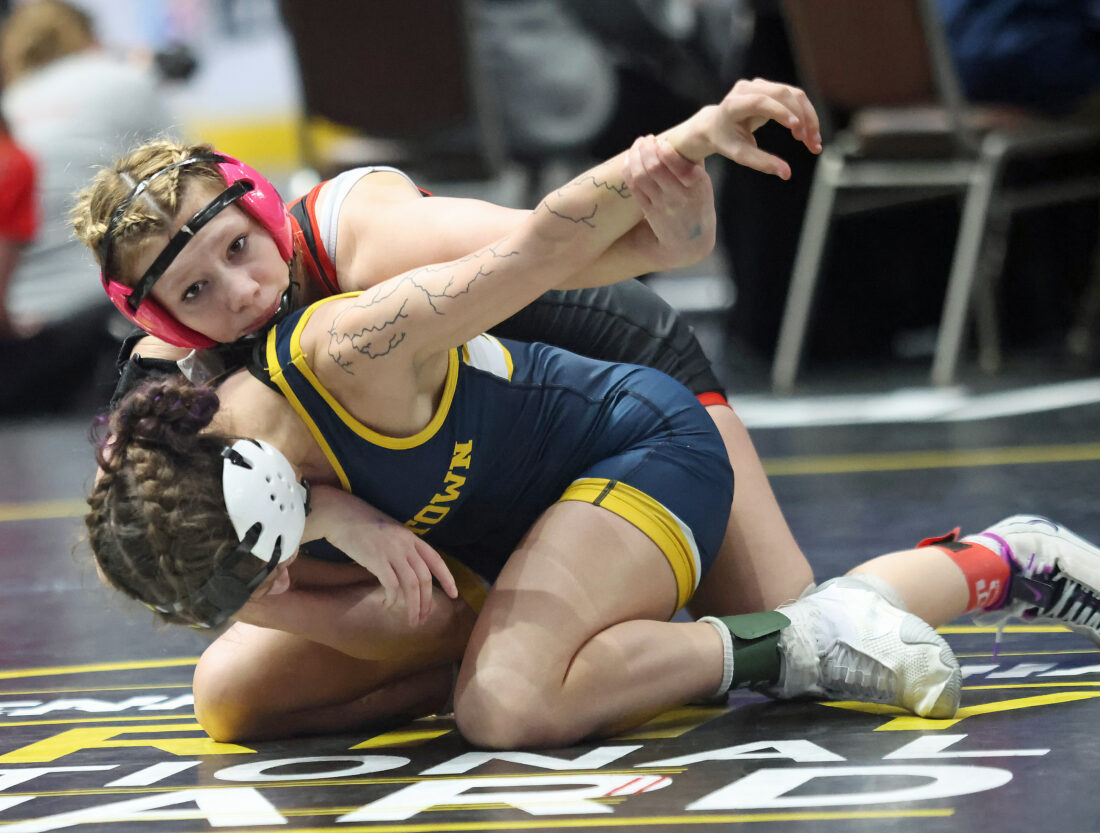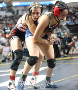 CHRIS MANNING/Sun-Gazette Correspondent Williamsport's Lillian Rumsey wrestles Saegertown's Leah Sample in the 118-pound quarterfinals during the PIAA Girls Wrestling Championships on Friday, Mar. 6, 2026, at the Giant Center in Hershey.