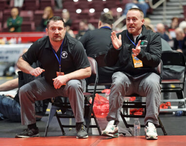 CHRIS MANNING/Sun-Gazette Correspondent Hughesville girls wrestling head coach Royce Eyer and an assistant coach cheer for Avery Earnest as she competes in the 142-pound quarterfinals during the PIAA Girls Wrestling Championships on Friday, Mar. 6, 2026, at the Giant Center in Hershey.