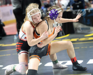 CHRIS MANNING/Sun-Gazette Correspondent Montgomery's Zoe Furman wrestles Octorara's Ella Teufert in the 136-pound PIAA semifinals on Friday, Mar. 6, 2026, at the Giant Center in Hershey.