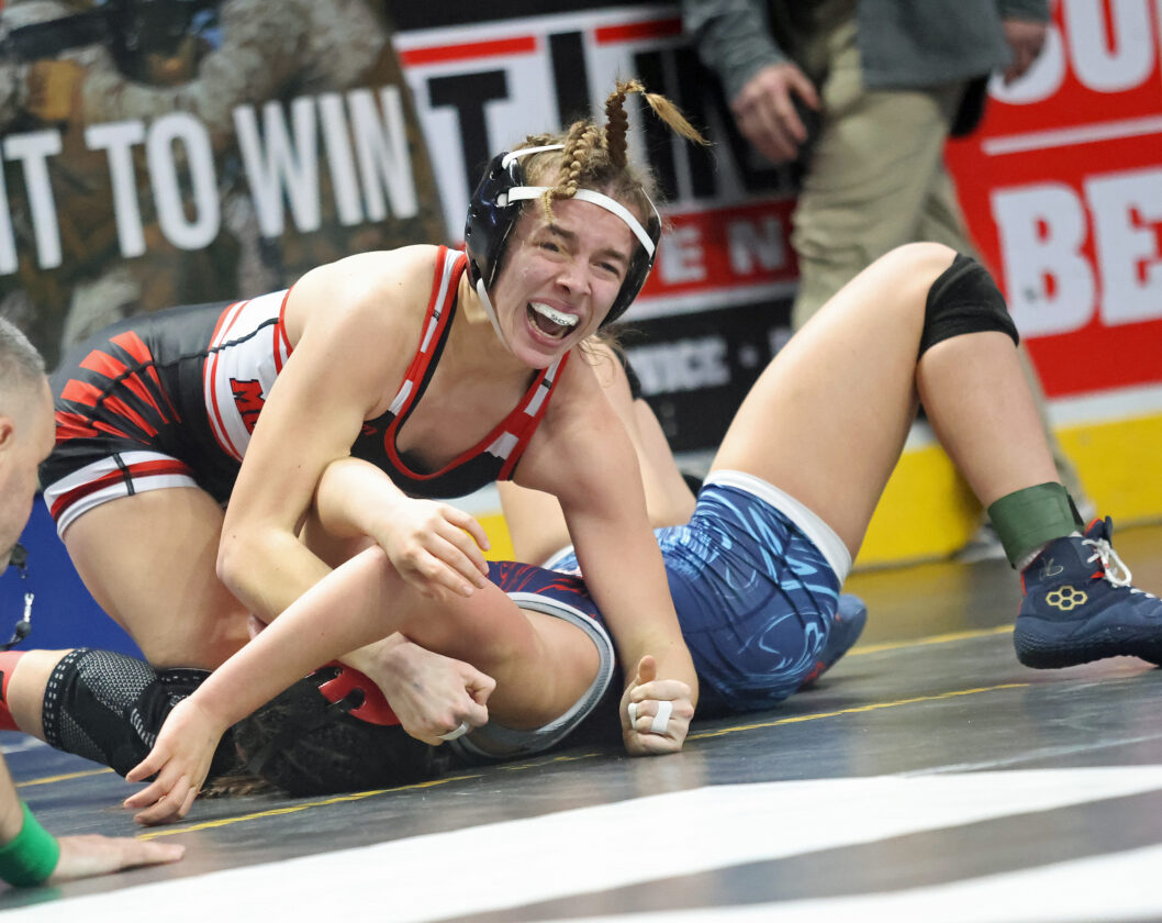 - CHRIS MANNING/Sun-Gazette Correspondent Montgomery’s Zoe Furman celebrates as she secures for a pin against Octorara’s Ella Teufert in the 136-pound semifinals during the PIAA Girls Wrestling Championships on Friday, Mar. 6, 2026, at the Giant Center in Hershey.