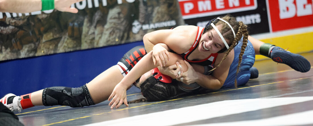 CHRIS MANNING/Sun-Gazette Correspondent Montgomery's Zoe Furman smiles as she works for a pin against Octorara's Ella Teufert in the 136-pound PIAA semifinals on Friday, Mar. 6, 2026, at the Giant Center in Hershey.