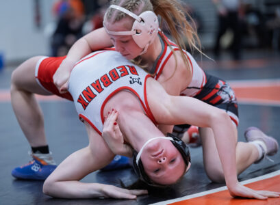 - FRANK DIMON/Sun-Gazette Correspondent Montgomery’s Jenna Houseknecht wrestles Redban Valley’s Breanna Crawford during the Central Regional tournament.