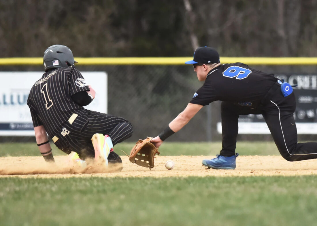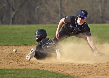 - LARRY DEKLINSKI/Special to the Sun-Gazette Southern Columbia’s Ayden Hockenbroch steals second base before Warrior Run’s Tyler Ulrich is able to field the ball during Tuesday’s game at Southern.