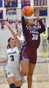 - MARK NANCE/Sun-Gazette Correspondent Loyalsock’s Alaina Dadzie (30) shoots around Hughesville’s Kylie Temple (3) in the third quarter.