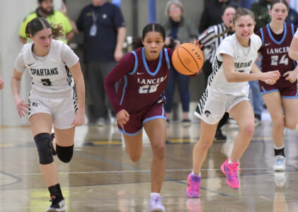 MARK NANCE/Sun-Gazette Correspondent Loyalsock's Jaekairah Harden (22) drives the ball down court ahead of Hughesville's Kylie Temple (3) and Kendall Hamm (12) in the third quarter.