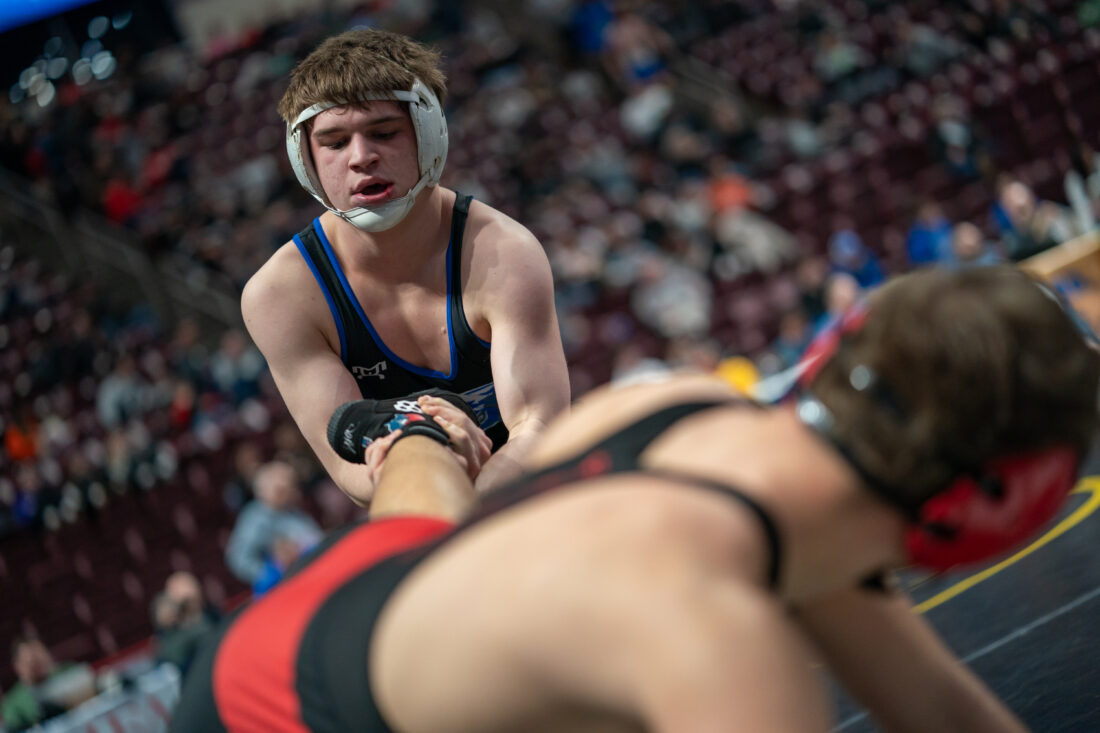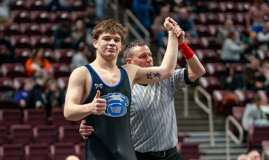 Warrior Run’s Reagan Milheim’s undefeated season is continuing on the first day of the PIAA Class AA wrestling championships as the American commit cruised to a first-round win at 160 pounds to lead a day of success for Warrior Run wrestlers.