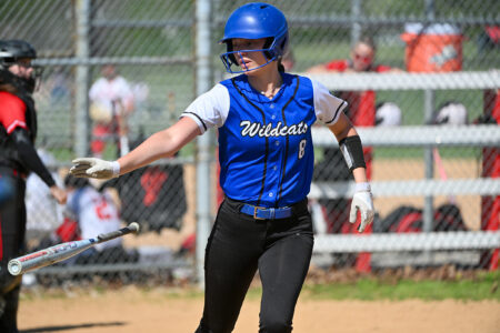 - TIM WEIGHT/Special to the Sun-Gazette Central Mountain’s Payton Williams (8) tosses her bat after a hit during a softball game against DuBois on Friday at Bellefonte. The Wildcats won 6-3.