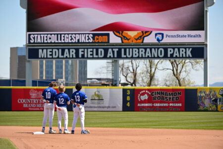 - TIM WEIGHT/Special to the Sun-Gazette Three Central Mountain players participate in the National Anthem prior to its Happy Valley Baseball Classic matchup against State College on Saturday, April 11, 2026, at Medlar Field in State College. the Wildcats won 6-5 in eight innings.