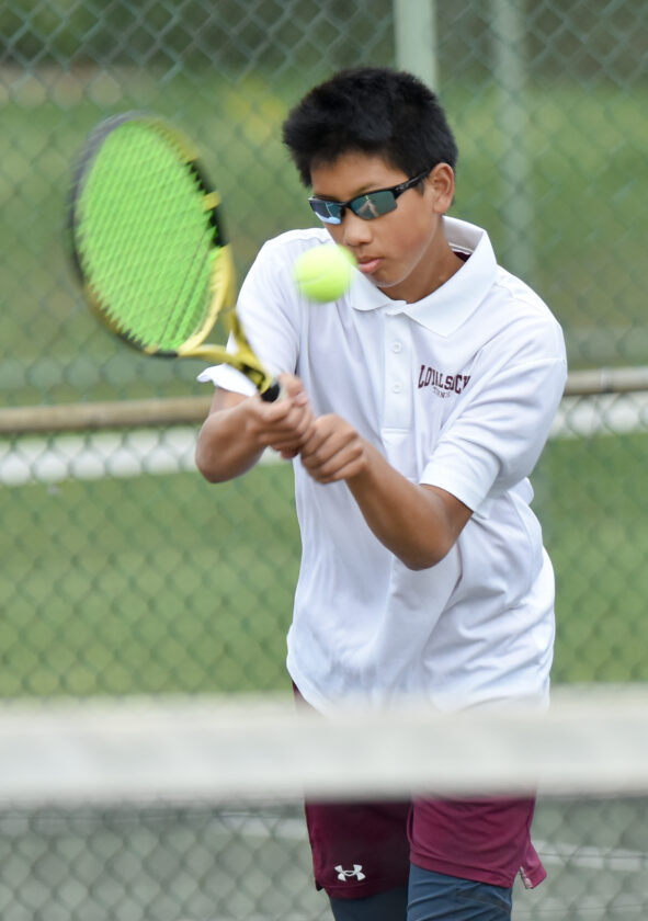 - MARK NANCE/Sun-Gazette Correspondent Loyalsock’s Elijah Lin returns a shot from Galeton’s Corbin Basile in the #1 seed match at Bruce Henry Park Tuesday.