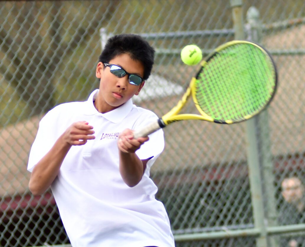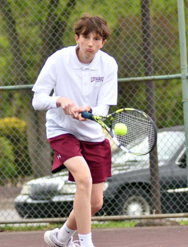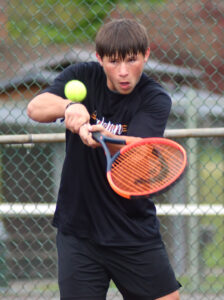 - MARK NANCE/Sun-Gazette Correspondent Galeton’s Max Schloegel returns a hit from Loyalsock’s Nathaniel DePrenda in the #2 seed match at Bruce Henry Park Tuesday.