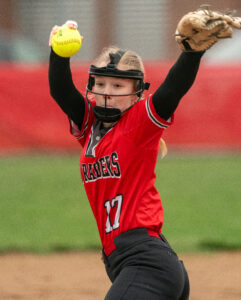 Jenna Houseknecht (17) of Montgomery pitches against Benton during the first inning in Montgomery. The Montgomery Red Raiders won 21-0. DAVE KENNEDY/Sun-Gazette