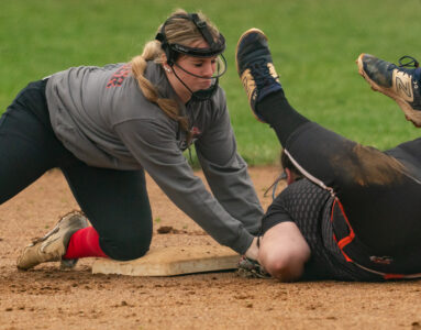 Madisyn Miller of Montgomery tags out Lynzee Carswell of Benton at second base in Montgomery. The Montgomery Red Raiders won 21-0. DAVE KENNEDY/Sun-Gazette